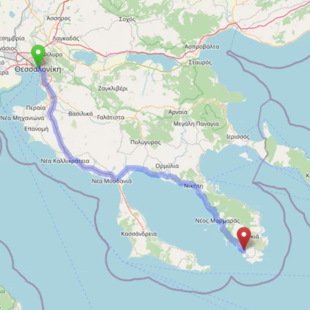 Sie fliegen nach Thessaloniki und beginnen Ihr Abenteuer in Griechenland auf gut ausgebauten und malerischen Straßen entlang der Küste bis nach Toroni. Parken Sie in direkter Nähe auf dem öffentlichen Stellplatz am Strandrand.