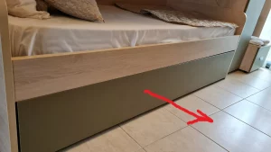 Bewegen Sie den Hebel unter dem Bett Richtung oben und drücken Sie gleichzeitig von oben nach unten auf die Matratze bis sich das Bett ganz abgesenkt hat. Halten Sie Ihre Hand am Besten seitlich, da das Frontpanel relativ weit runter geht, um sich nicht zu verletzen.